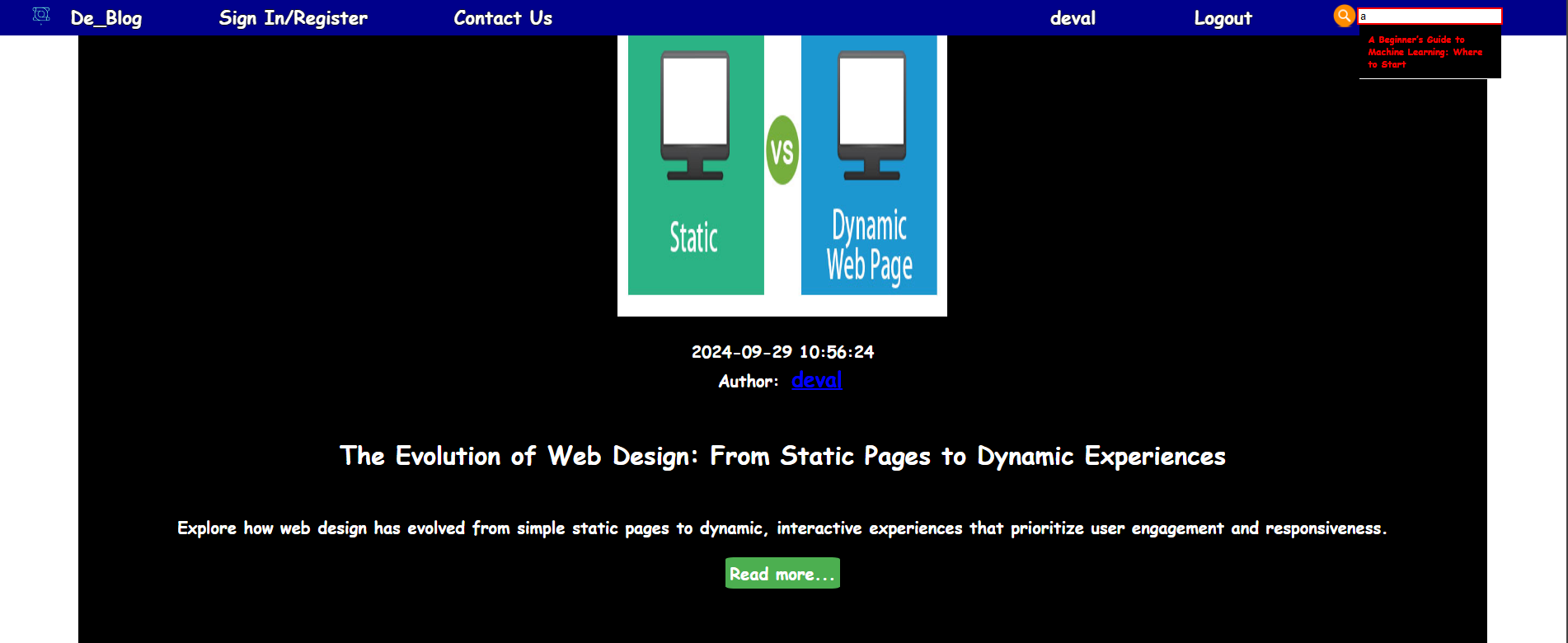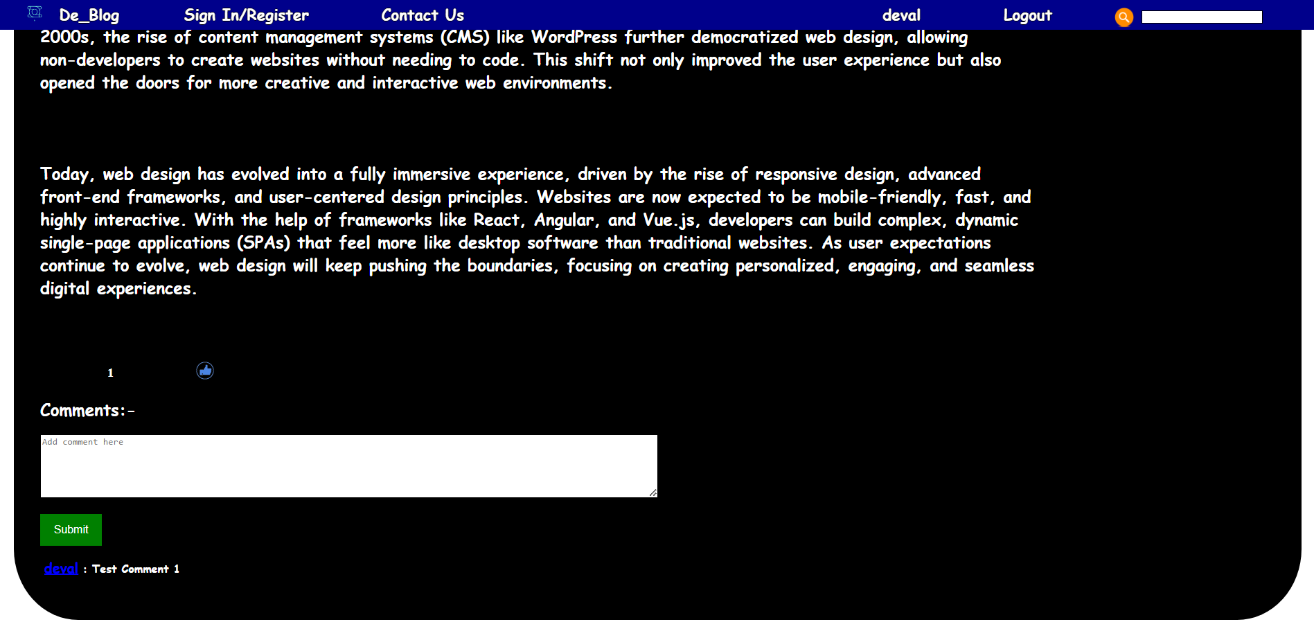 For my project, I developed a dynamic blogging website using HTML, CSS, JavaScript, PHP, and MySQL. The website features a home page that displays all published blogs, allowing users to browse content easily. It includes sign-in and registration pages, enabling users to create accounts and log in to access additional features. Once signed in, users can like and comment on blog posts, enhancing interactivity.