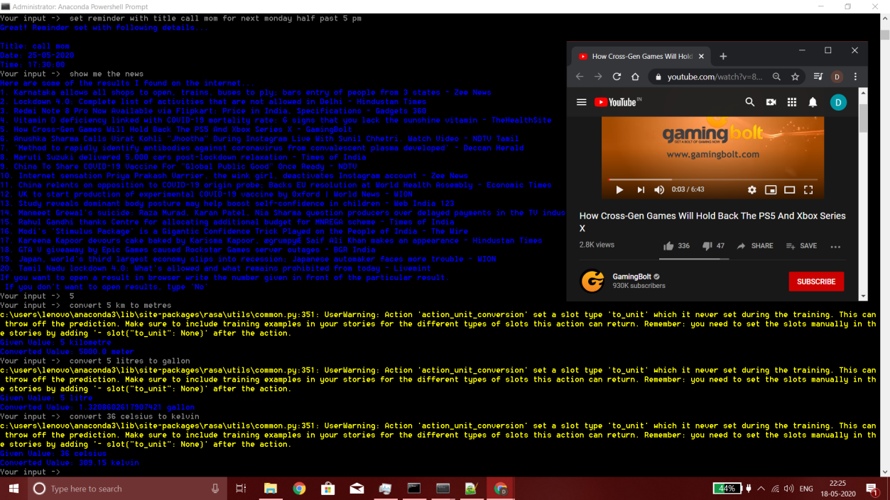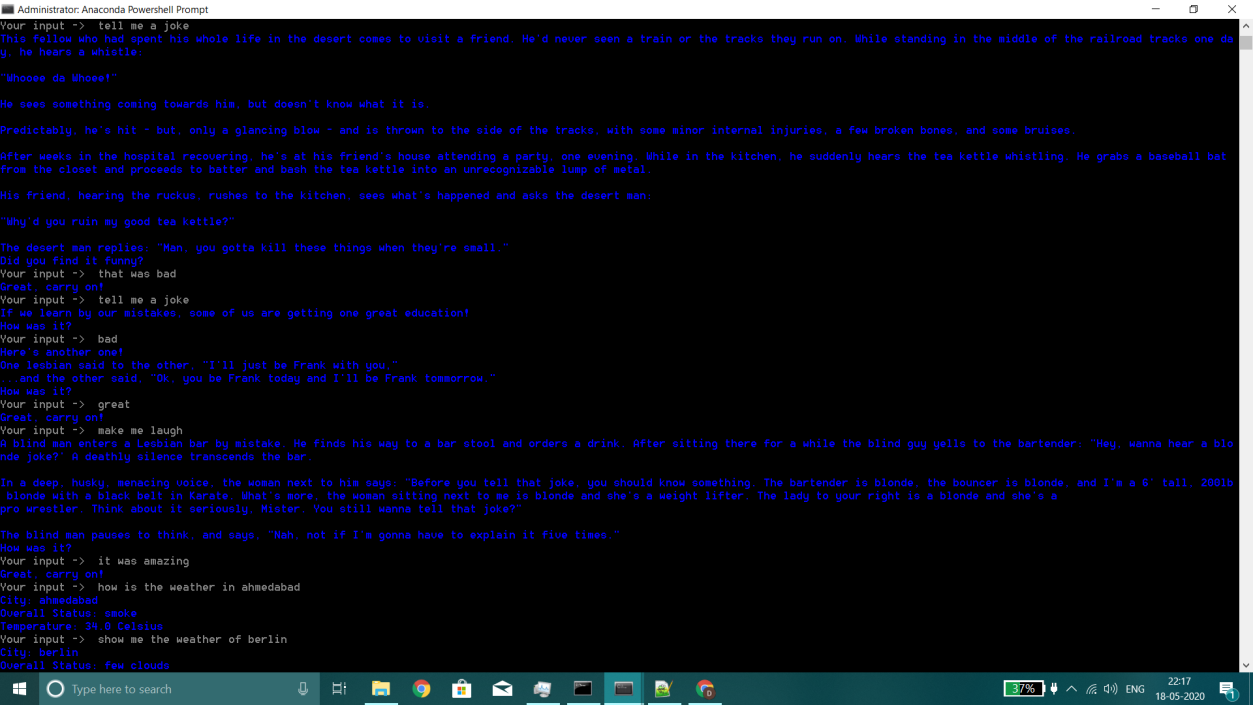 This project, titled "Chatbot as Personal Assistant", involves developing a chatbot capable of performing various tasks using Natural Language Processing (NLP), Artificial Intelligence (AI), and Machine Learning (ML). The chatbot offers functionalities such as setting reminders, telling jokes, providing weather updates, and performing web searches, among others. The system utilizes tokenization, entity extraction, and intent classification to interpret user queries and respond appropriately. Implemented using various NLP tools like SpacyTokenizer and CRFEntityExtractor, the project demonstrates the chatbot’s architecture, pipeline, and decision-making process using policies defined in the RASA framework.